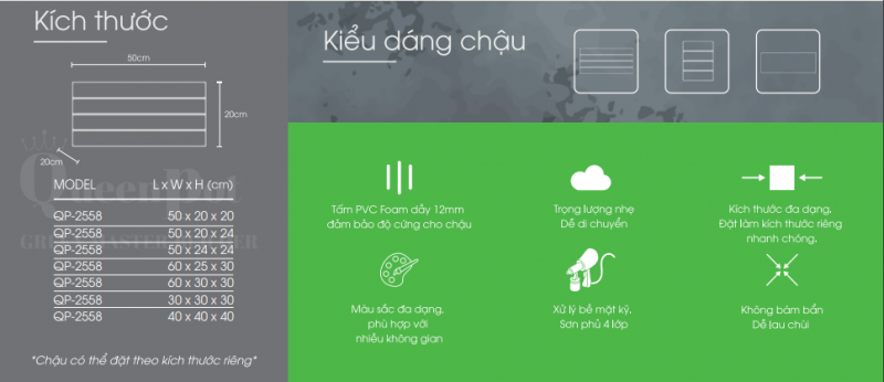 Queenpot là đơn vị tiên phong trong lĩnh vực sản xuất các dòng chậu composite, chậu composite sợi fiberglass, chậu xi măng nhẹ, chậu đá mài… Trong đó chậu composite kẻ chỉ là mẫu chậu được nhiều khách hàng quan tâm nhất.