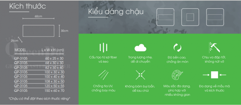 - Chậu composite Queen Rectangular Pot với kích thước đa dạng, có thể đặt hàng sản xuất theo thiết kế. giúp chủ nhân thỏa sức sáng tạo. Bạn sẽ dễ dàng thiết kế cho từng vị trí khác nhau.