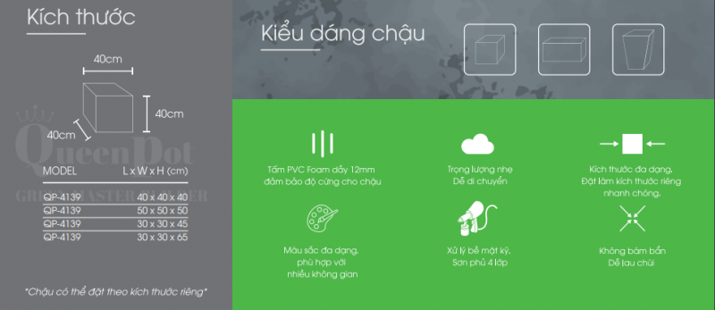 QUEENPOT nhận thiết kế, sản xuất các loại chậu composite theo yêu cầu. Đáp ứng mọi thiết kế, mọi màu sắc, mọi kích thước theo yêu cầu của khách hàng.